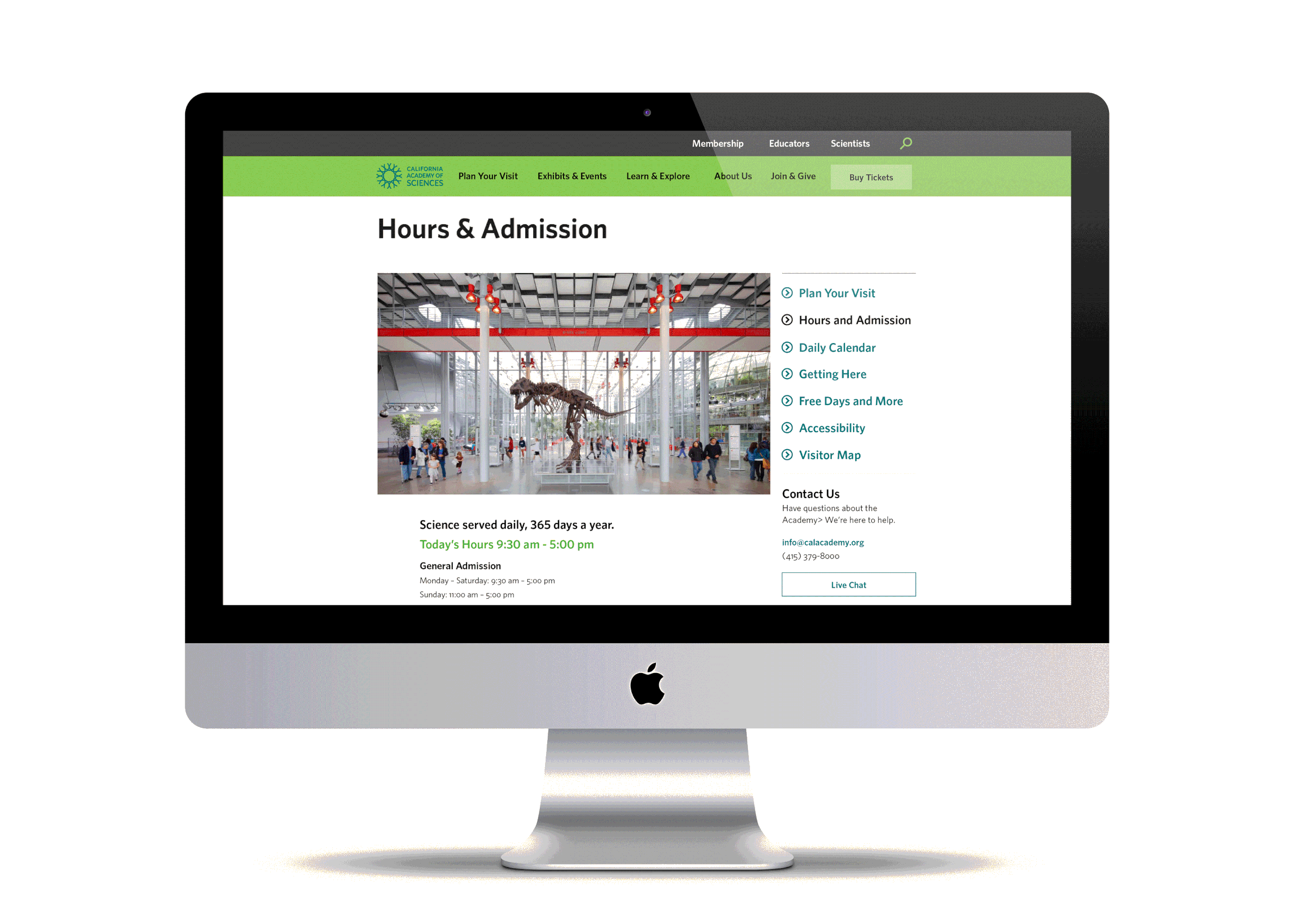 GIF of the Hours and Admissions page as one of the entry points to the ticketing purchase flow.