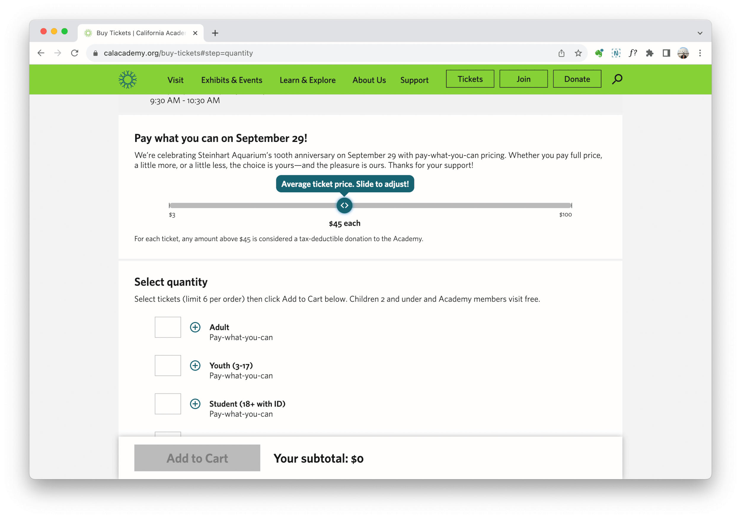 An interactive slider created for a “pay what you can” day. This slider changed the prices of the tickets below and the text along the slider changes at price intervals. This was so successful that “pay what you can” days became a regular part of the events calendar.