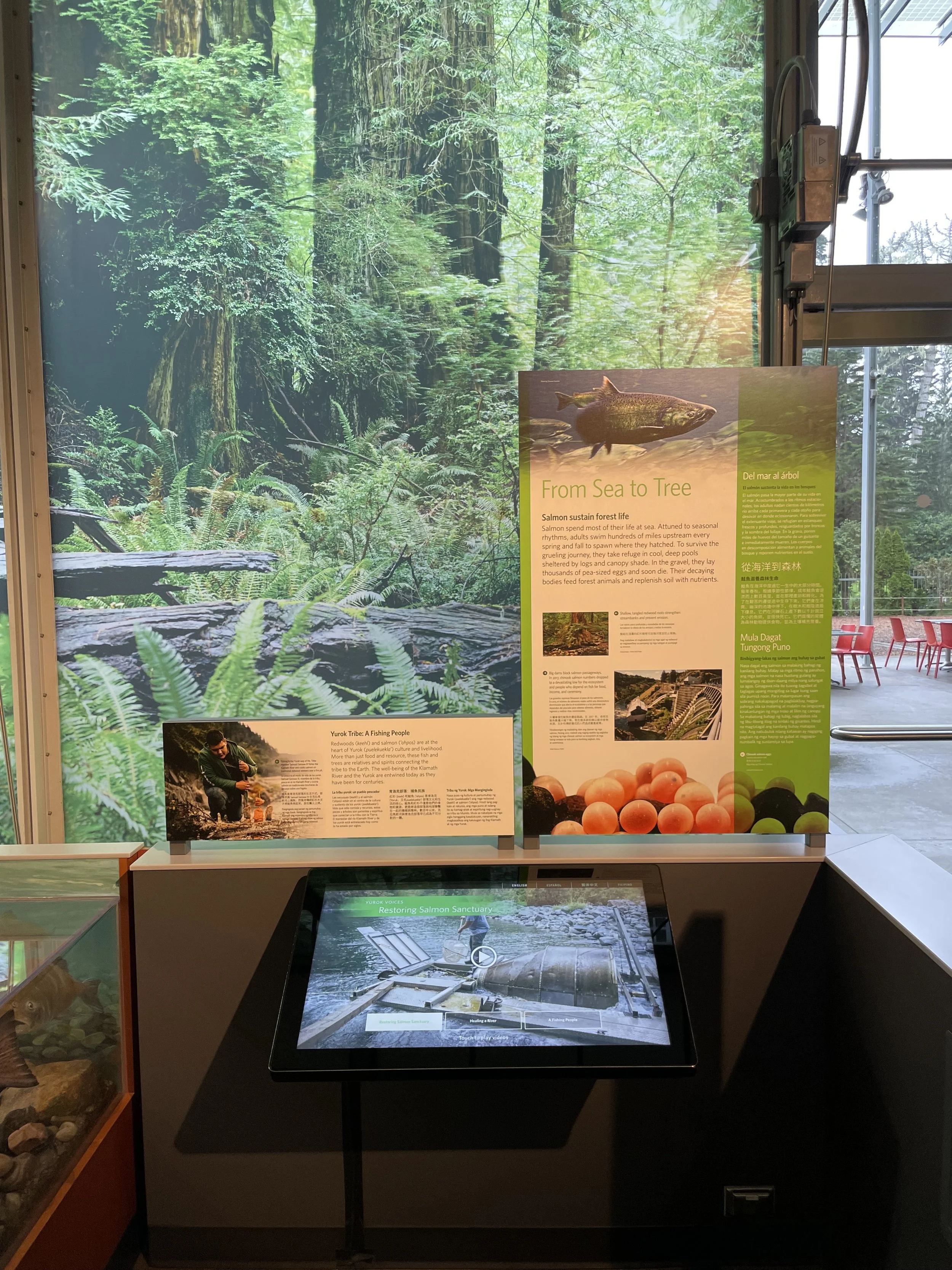 Installation of the screen and the graphics surrounding the interactive in the Giants of Land and Sea exhibit.