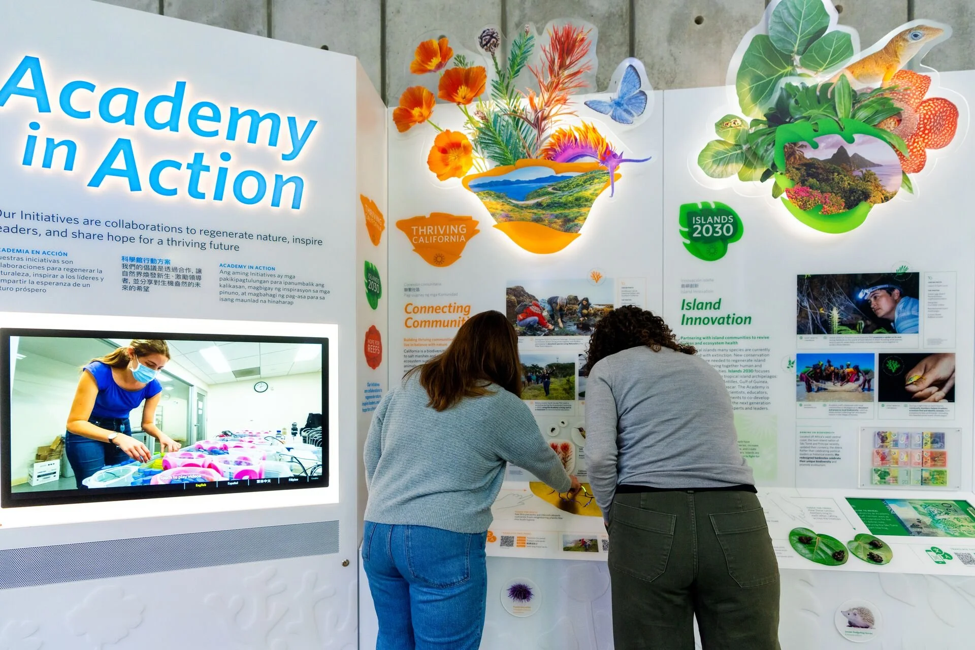 Installation of a video player screen in the Academy in Action exhibit. This large touchscreen was designed for the large number of videos created to document all of the projects included in the 3 museum initiatives. These initiatives are color coded with unique logo marks.