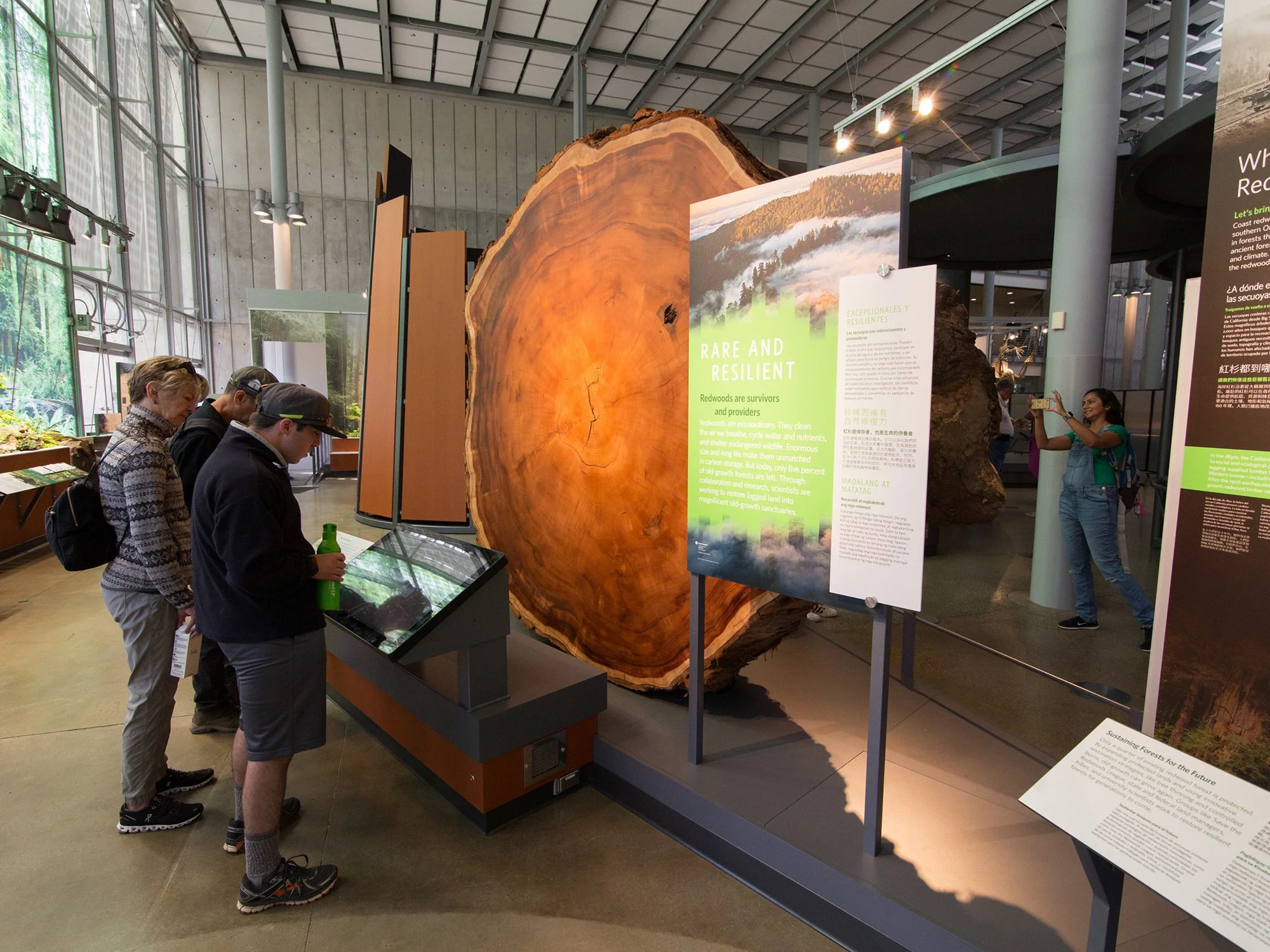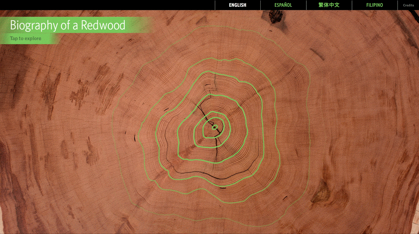 Touchscreen to learn more about a 6 foot wide redwood tree segment. Visitors could explore what was happening in the world during the nearly 700 years the tree was alive, as well as view specifics about what happened to this tree.